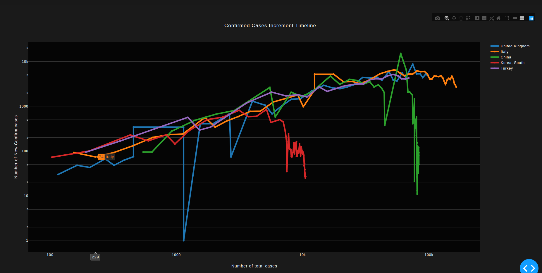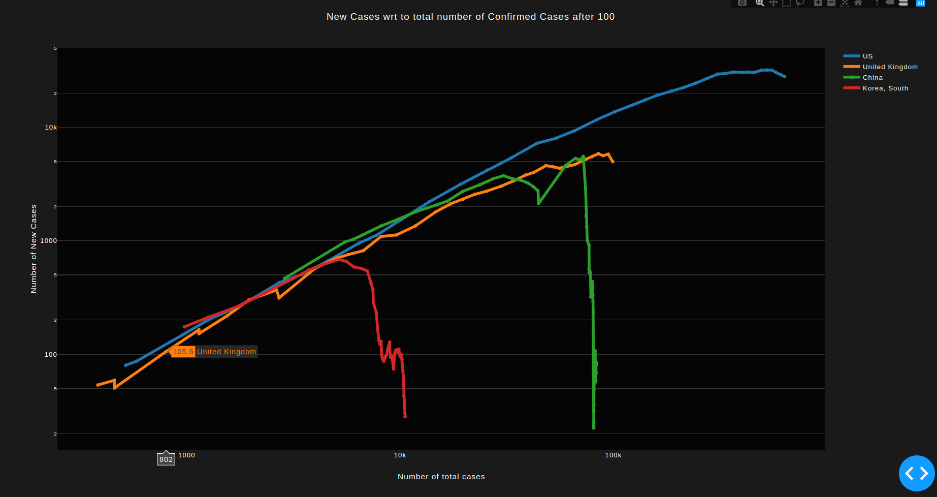 - A fall in the graph indicates lowering of new cases with total cases. i.e. We see that China and Korea are out of the danger of new cases. Italy and Spain are seeing small rates of controling the virus.